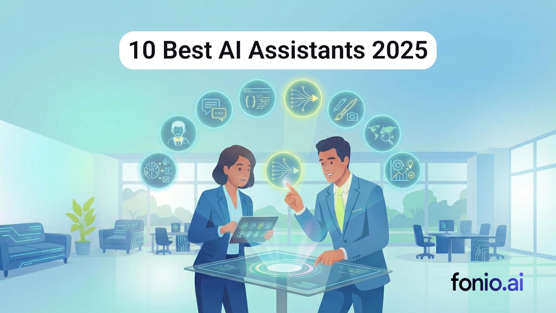 The 10 best AI Assistants in 2025 are ChatGPT, Gemini, fonio AI Phone Assistant, Claude, Microsoft Copilot, Perplexity, Breeze Copilot, Adobe AI Assistant, Canva AI Assistant, and Notion AI. AI Assistants are virtual assistants that increase productivity and reduce workload.